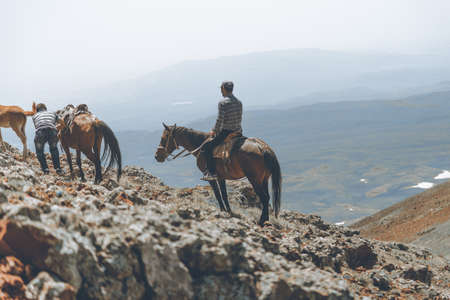 A route through mountain peaks and hills through majestic landscapes with horses in the distance. Active tourists, hiking, Caucasus Mountains Oshten Fisht. Sport lifestyle concept