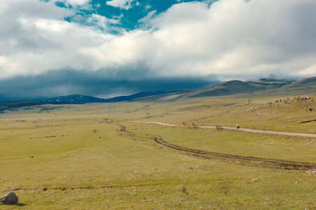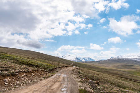 Lago Naki spring plateau with snowy hills, blue sky and clouds.
