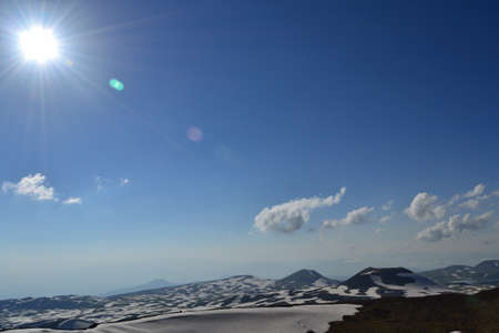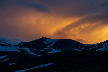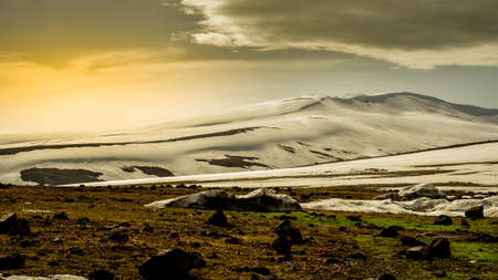 Mountains and volcanoes with snow at sunset on Vilyuchinsky pass in Kamchatka peninsula, Russia. Beautiful summer landscape