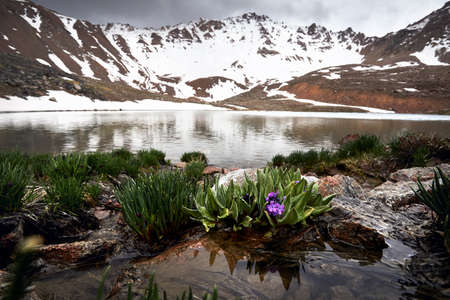 Beautiful scenery of the mountain lake and purple alpine primrose flowers on the beach against white snow mountains Almaty, Kazakhstan