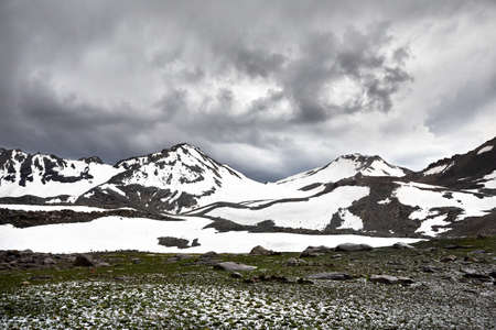 Beautiful scenery of the mountain valley with snow cap summit and against dark overcast sky. Outdoor and hiking concept