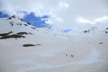Snow-capped peaks of the Caucasus Mountains. Exciting landscape along the military Georgian road