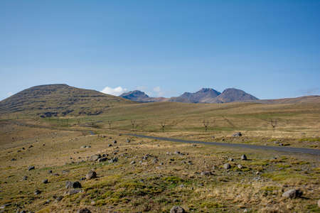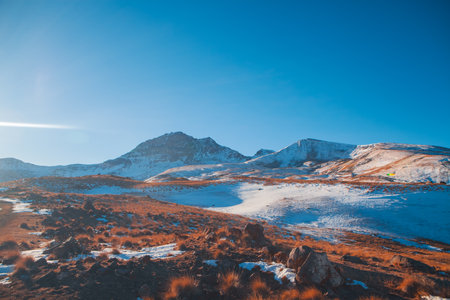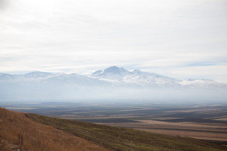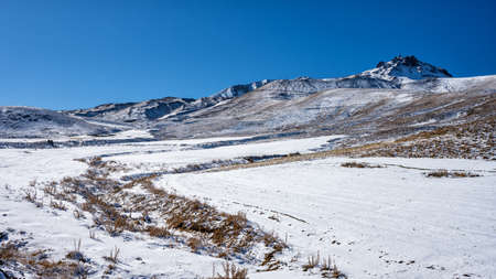 Beautiful peaks of Aragats mountain in Armenia covered with snow and fields during the late autumn time.