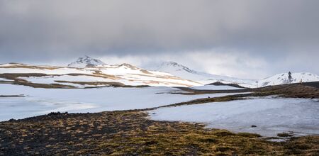 Typical Icelandic landscape with mountains and meadow land covered in snow at snaefellsnes peninsula in Iceland