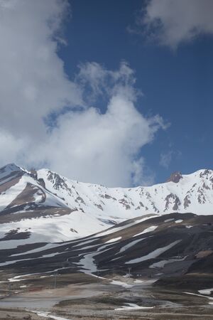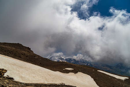 Vertical shot of Erjiyes mountain peak covered with snow and clouds with some melting snow