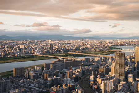 Aerial view of Osaka downtown at sunset
