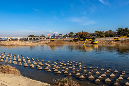 River conservation work using a hydraulic excavator at Muko River, Hyogo