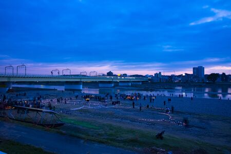 Sunset view at Yodogawa river bank with railway and buildings in the background