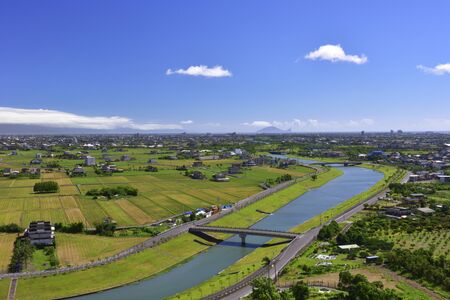 The local plain with river is shined upon by sunset beautifully.