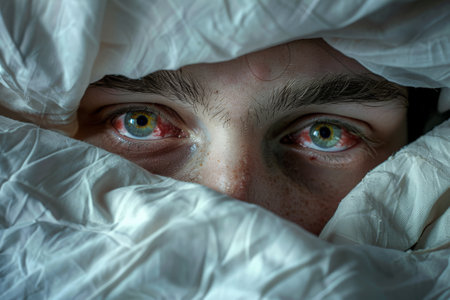 Eyes peering from under the covers, capturing the intense feeling of someone battling insomnia.