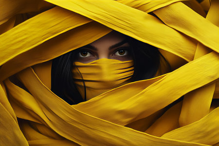 A woman's face is covered in paper, giving the impression of a mask. The image has a surreal and dreamlike quality, with the woman's features obscured by the paper. Scene is mysterious and intriguing