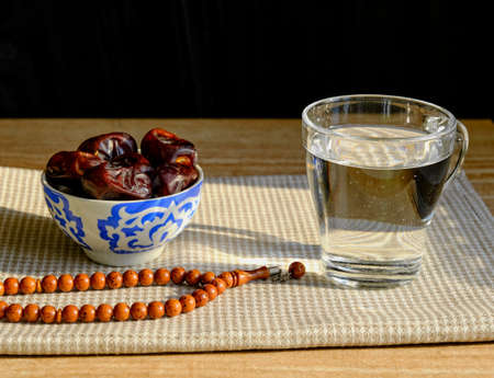 Cup with a traditional oriental pattern with dates, a glass of clear water, stone rosary on a napkin during sunset. The first meal, Muslim fast Eid al, Uraza