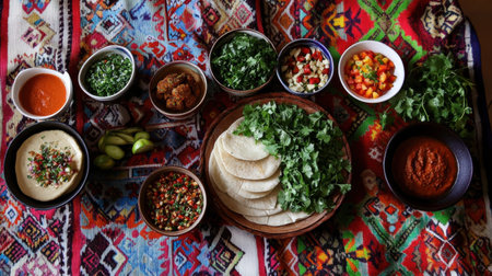 A Fresh mezze spread with falafel, herbs, and sauces