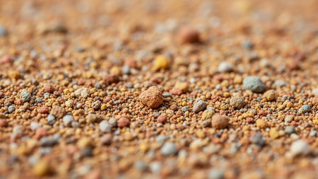 A macro view of small pebbles and soil, showing a variety of colors and granular textures in sharp detail.