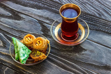 Turkish dessert. Oriental sweets with nuts and honey on a wooden background.