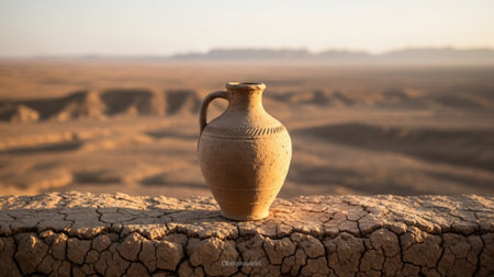 A striking cinematic wide shot capturing a traditional Kuzah (clay water jug) resting on a sun-drenc