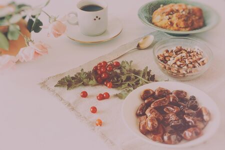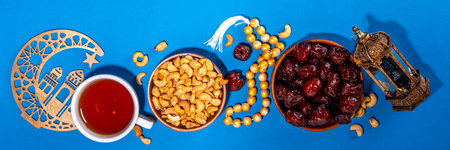 Ramadan muslim holiday background, with traditional treats - dates, nuts, dried fruits, sweets, religion rosary beads, lantern, tea, islamic Mosque, crescent moon Ramadan Kareem themed decorations
