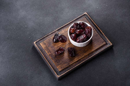 Beautiful delicious dates on a dark concrete background. Tasty healthy fruit