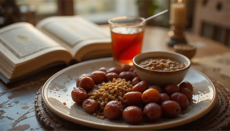 Golden hour light bathes a rustic scene of dates, couscous, and a bowl of warm chickpeas. A glass of tea and an open book add a tranquil, contemplative mood.