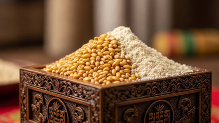Wheat grains and flour in ornate box, close-up, blurred background