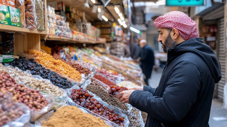 A man examines a selection of dried fruits and nuts at a market stall, with various colorful options.