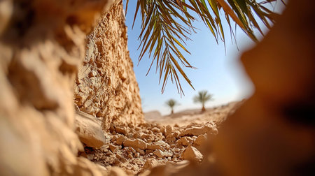 A detailed shot of a palm tree trunk with a desert scene, showcasing the texture and environment.