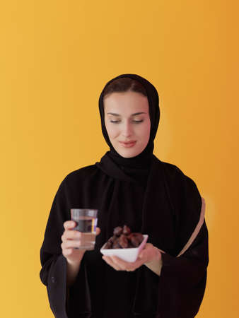 Modern muslim woman in abaya holding a date fruit and glass of water in front of her