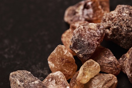 Brown sugar in crystals on black background.