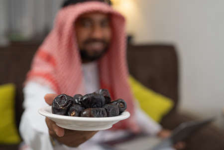 close up of a plate of dates brought by an arab businessman wearing a turban working in the office