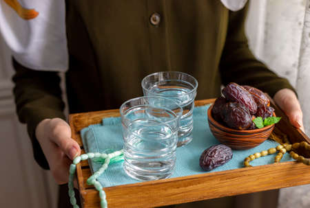 A female hand holds a tray with dates, and water and a rosary - hthe things used to break the fast at sunset during the Muslim holy month of Ramadan. Selective focus, place for text.