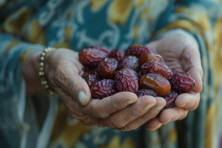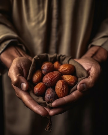 A Muslim man offers traditional dates in a food charity gesture for Ramadan and Eid. - image generated with Generative AI