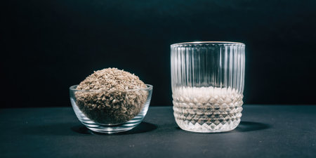 A bowl and glass filled with grains on a dark counter.