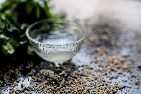 Exfoliating skincare face mask on a black colored surface consisting of some coriander leaves and egg white along with some oats.