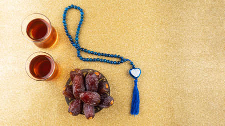 Islamic rosary with dates and tea. Ramadan Kareem concept.