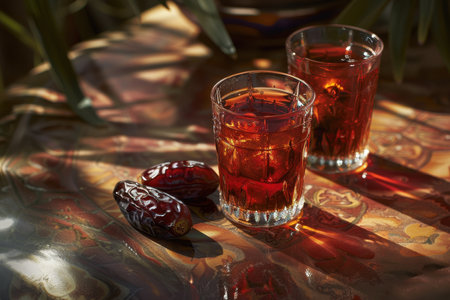 Red tea in glass, dates in the plate and hard light with harsh shadows, Close up.