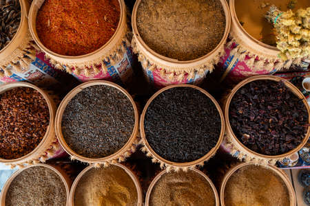 Various Colorful Spices and Grain Seeds on the famous Khan el-Khalili bazaar and souq (or souk) in the historic center of Cairo, Egypt