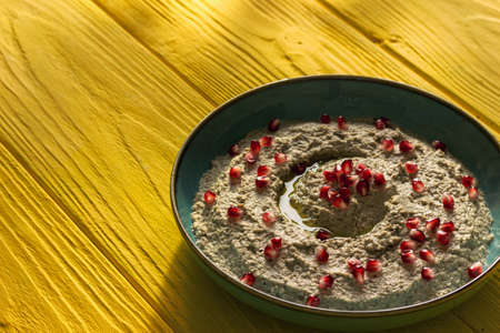 Baba ganoush or mutabal, Middle Eastern eggplant dip sauce garnished with pomegranate seeds, served in a light blue plate on a yellow wooden table with gobo light