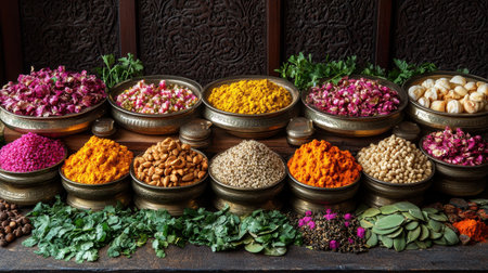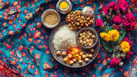 A beautifully arranged tray of rice, spices, nuts, and fresh flowers showcases traditional Indian culinary elements on a vibrant textile, perfect for festive celebrations.