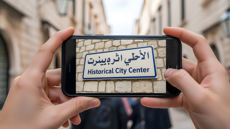 Smartphone held by hands capturing a sign for Historical City Center in Arabic and English