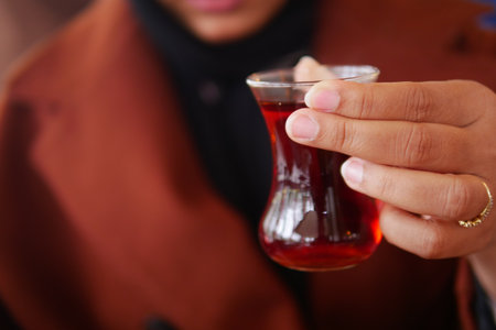 Beautiful eastern cup in hand of woman