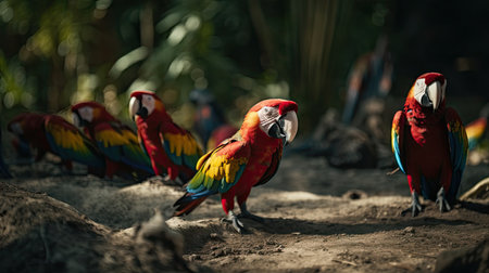 Vibrant scarlet macaws gather on a rocky outcrop, their brilliant plumage reflecting in the tranquil waters of a rainforest pond. Generative AI