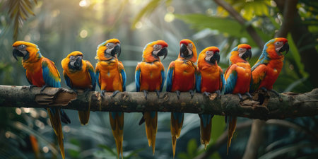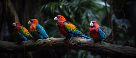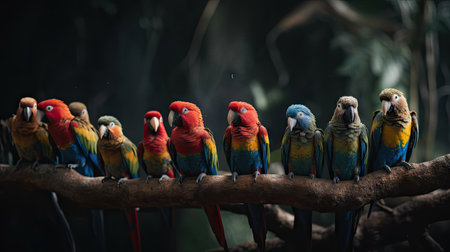 Close-up of flock of five colorful parrots sitting on the branch. Generative AI