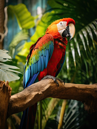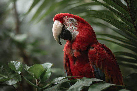 Scarlet macaw with vibrant plumage in lush tropical jungle. Concept of exotic bird, rainforest wildlife, colorful parrot, nature habitat.