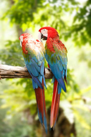 beautiful Scarlet macaws on a branch in a tropical forest.