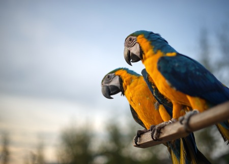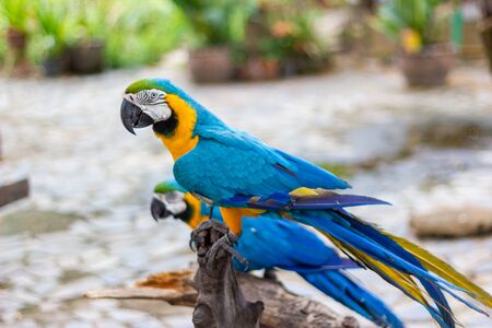 Bird Blue-and-yellow macaw standing on branches of Tree