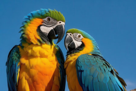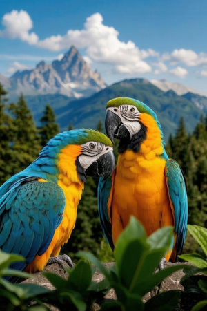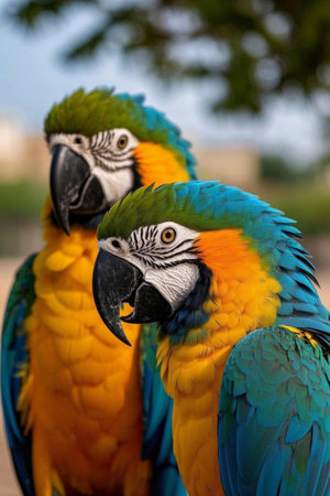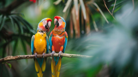 Two vibrant parrots sit closely on a branch, showcasing their colorful feathers amidst lush greenery, capturing the beauty of nature and wildlife.