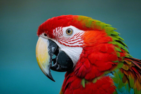 beautiful Scarlet macaw close up portrait on the blue sky background