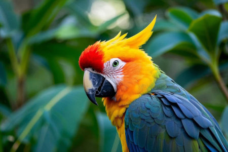 Vibrant closeup of a scarlet macaw perched among tropical greenery in a lush habitat