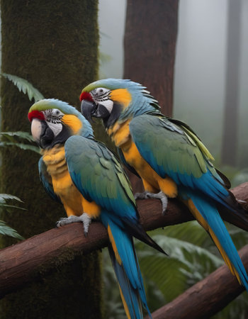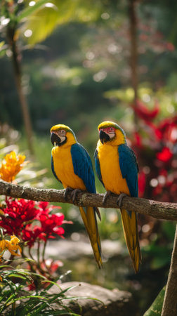 Two vibrant blue and gold macaw parrots are perched gracefully on a branch, creating a stunning display of tropical beauty in a lush rainforest setting
