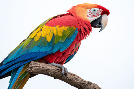 A scarlet macaw with vivid red, yellow, green, and blue feathers perched on a branch against a white background.